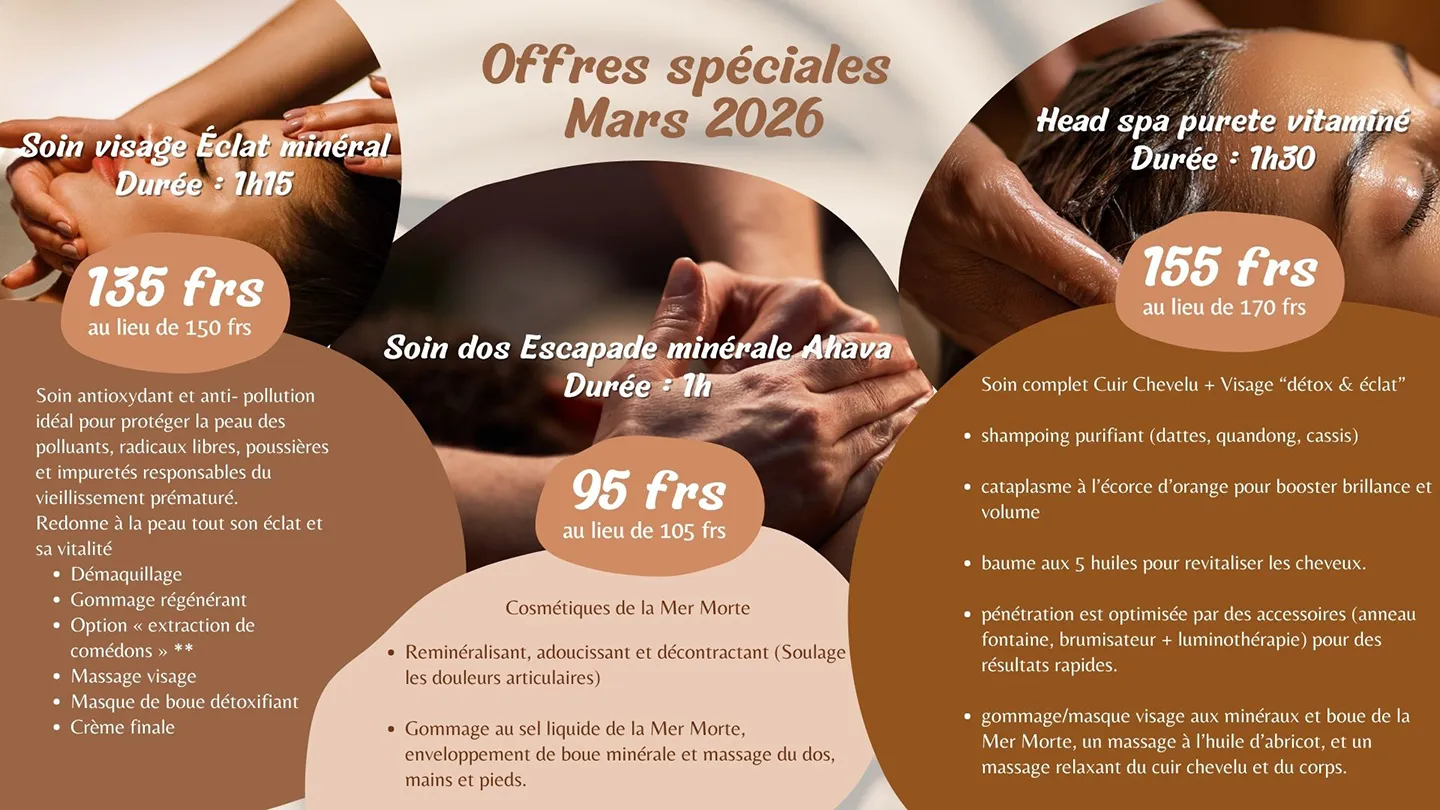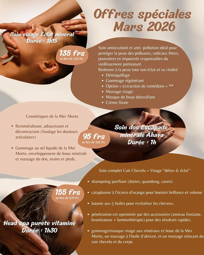 Offrez-vous un moment d’exception où chaque soin devient un rituel. Inspirés des richesses marines et des traditions ancestrales, nos protocoles allient efficacité et raffinement : massages aux huiles précieuses, gommages sensoriels aux sels de la Mer Morte, enveloppements régénérants… Une expérience haut de gamme pensée pour sublimer le corps, apaiser l’esprit et révéler l’éclat de votre peau.